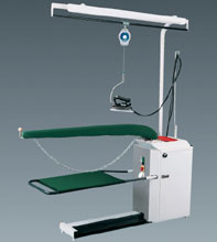 For dry-cleaning industry, finishing ironing table with vacuum and blowing function changeable automatically by the foot pedal. 500x1400mm heatable, aluminium flat ironing board with 1 kW heating element, controlled by a thermostat, 0,55 kW/380 V exhaust motor. Equipped with silicone iron mat and antenna for holding up the iron cables. Additional equipment: